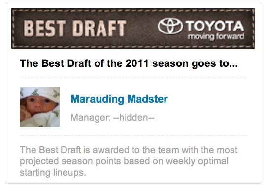Even before the first snap of the 2011 NFL Season – Our 5-week-old graciously accepted her first award of the year according to the people at Yahoo and Toyota – She won the Best Draft for the 2011 season.