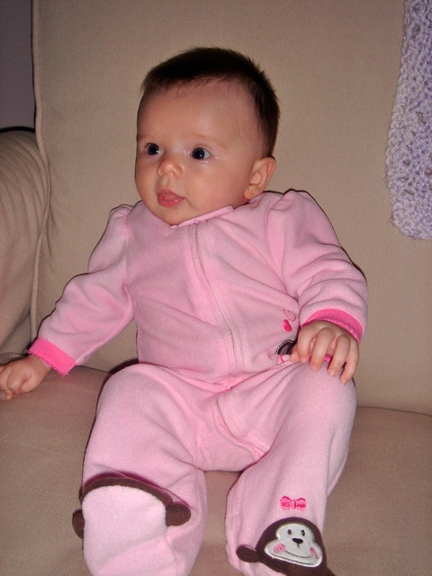 Maddie looks absolutely adorable in her monkey sleeper.