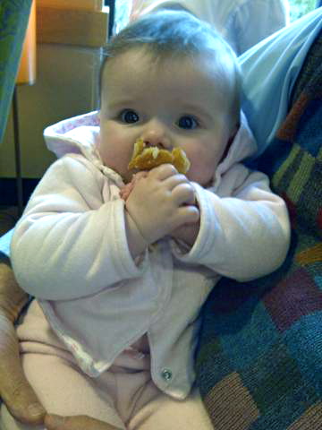I kept a piece of bread in Maddie’s hand during lunch because she’s made it very clear that everyone should eat together during mealtime. She also enjoys sharing soggy dough with the clothes being worn by whoever has the pleasure of holding her at the time.