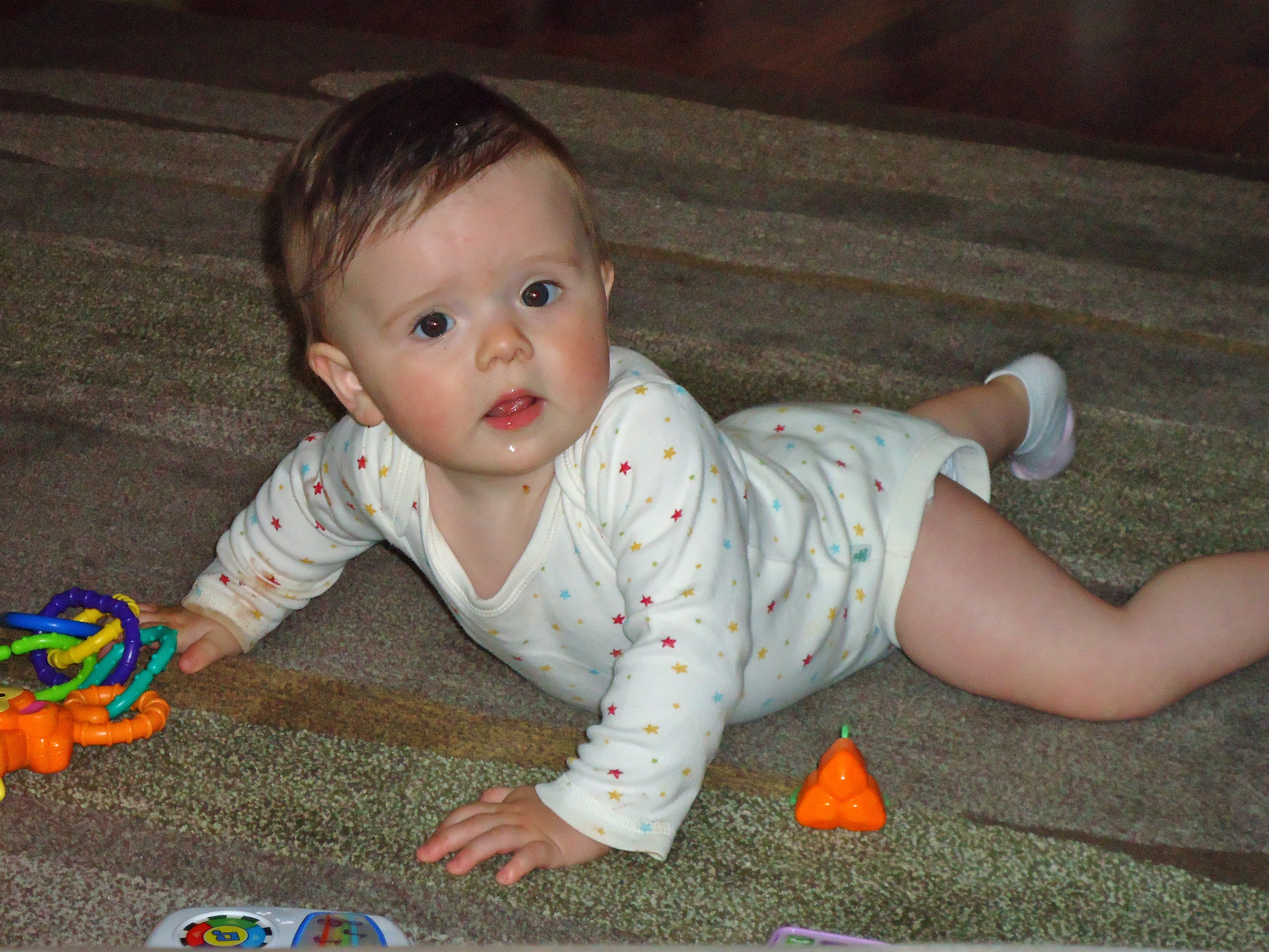 Maddie really had us fooled this weekend. We thought for sure she was ready to start crawling up a storm. She’s been assuming the crawl position for some time now. She has also become quite the expert at flipping from her back to tummy or vice-a-versa. However, since all of her past forward facing efforts have led to moving backwards, she devised the perfect alternative – – – the SCOOT.