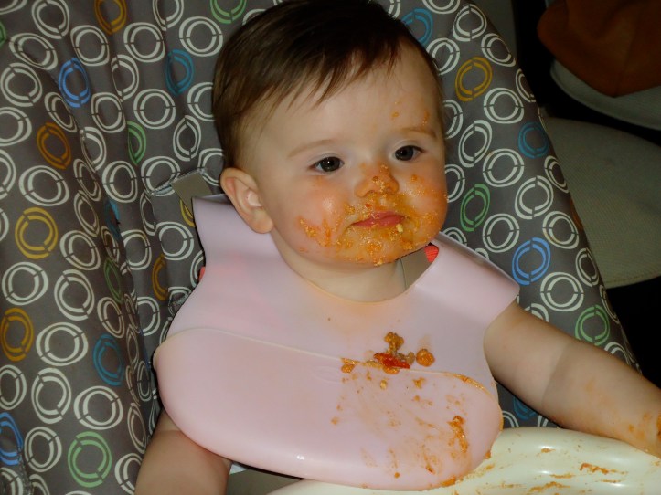 The baby then proceeded to yank on various cabinet doors to she if could yank them open. Each one held firm, but Maddie vowed that these doors would not be safe for long and she would be back. It was then that we whisked her to her high chair where she could enjoy some nice lasagna.