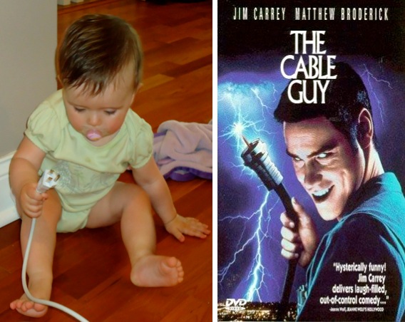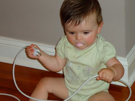 The baby’s newest trick is what’s known as, “Grip it and Rip it!” Maddie is now constantly on the hunt for electrical cords. Once she sees one, all bets are off – “Go marine, GO!!” Her little knees spring into action and merge into a blur as she closes in on that cord du jour.