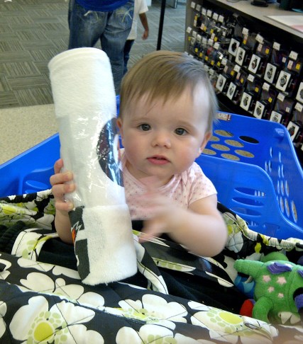 I had to sort through several items to get the one I needed when I noticed that Maddie was doing some shopping of her own. She lifted a Gatorade towel off the shelf and into the cart with her. After a quick inspection, I saw that Grabby had actually made a good choice here. I let her hold on to her latest conquest while we executed another lightning checkout.
