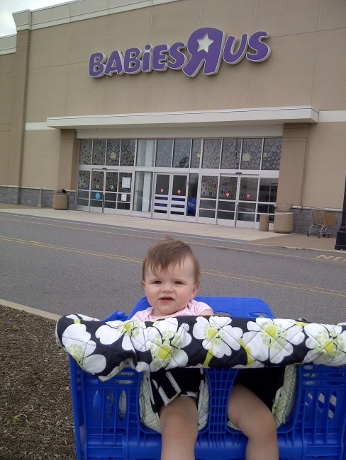 Today we stood ready two storm two different retail establishments: Baby’s r Us and the Sports Authority. Maddie was juiced and ready to go. I led off our initial assault armed with a wide variety of distractions including some edible wagon wheels, a squeaking penguin and some bagel pieces. How long these would protect me was anyone’s guess.