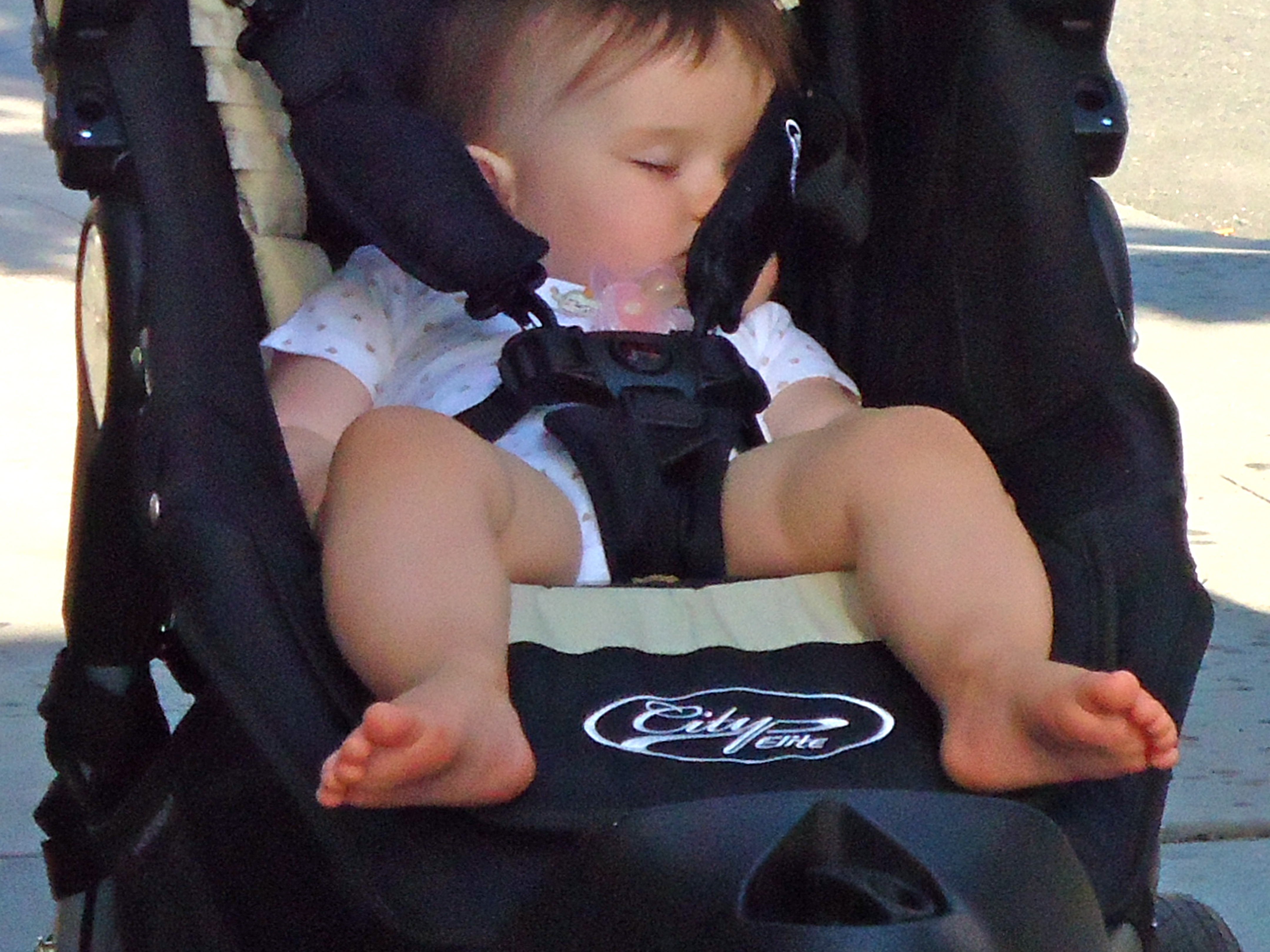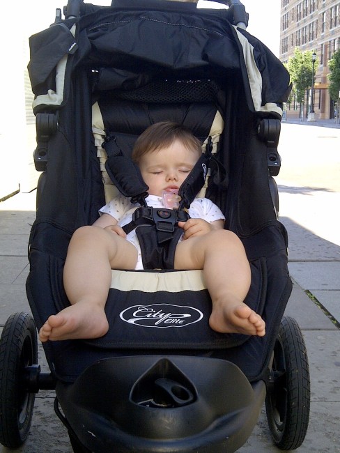 As I quickened my pace to avoid any further controversy, I noticed that the stroller compartment had fallen uncharacteristically silent. I slowed my pace so that I could catch a glimpse of what Maddie was up to now. I almost tripped and fell over when I saw that she was actually sound asleep???