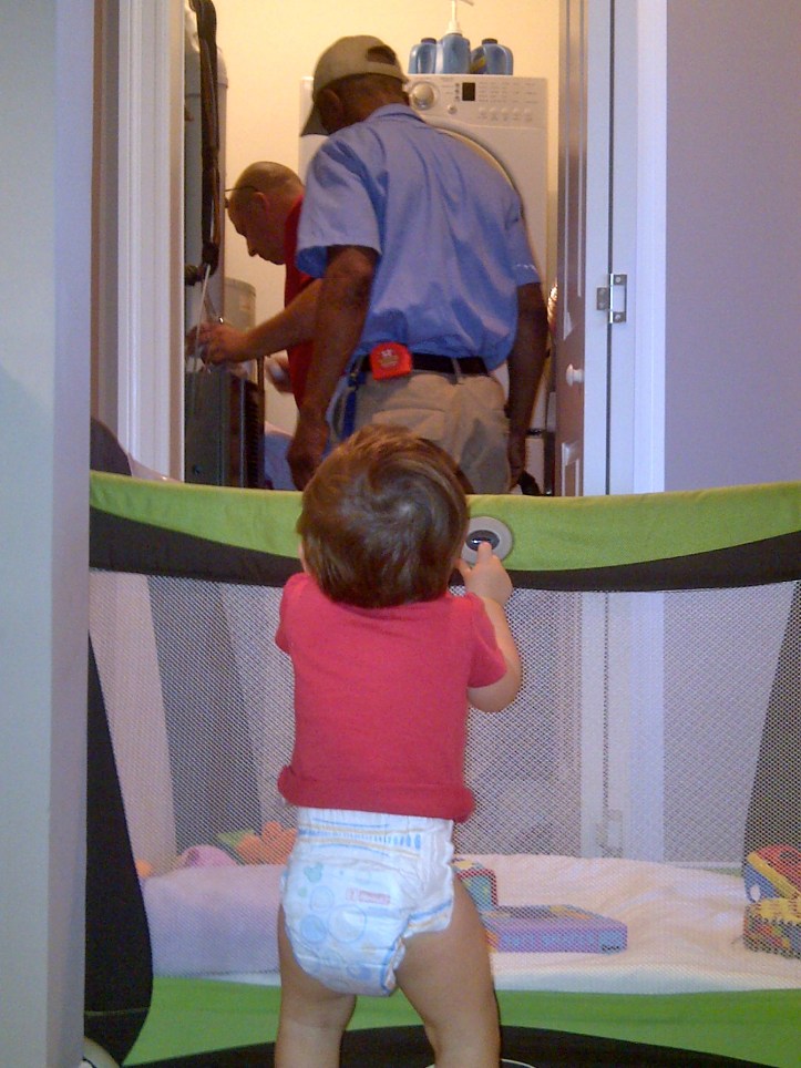 After two miserable days with a less-than-satisfactory performance from our air conditioning unit, Maddie was at her wits end. So when the repair people came calling this morning, the baby was hot to trot to help them out. Where ever they roamed, Maddie was not far behind.