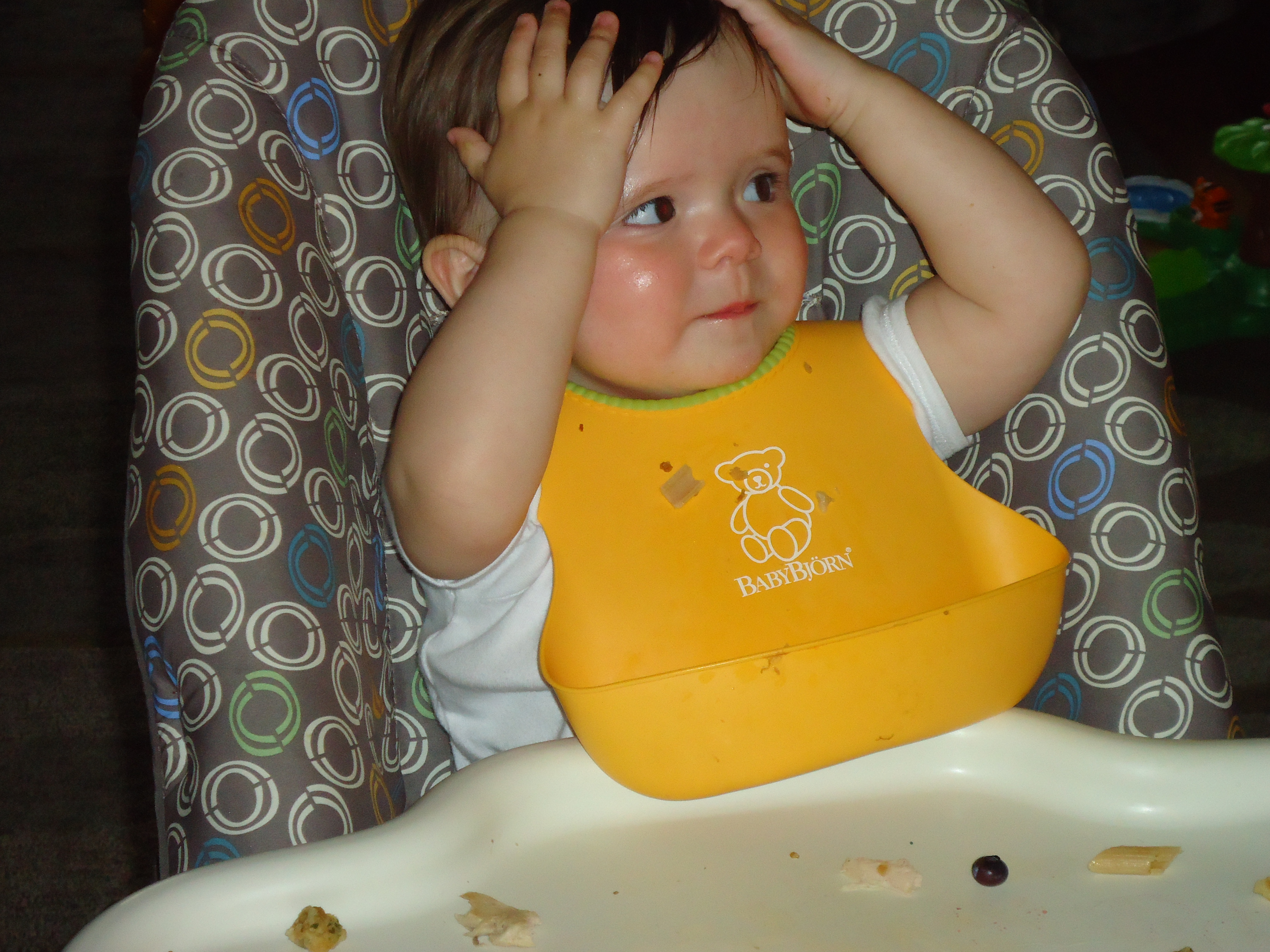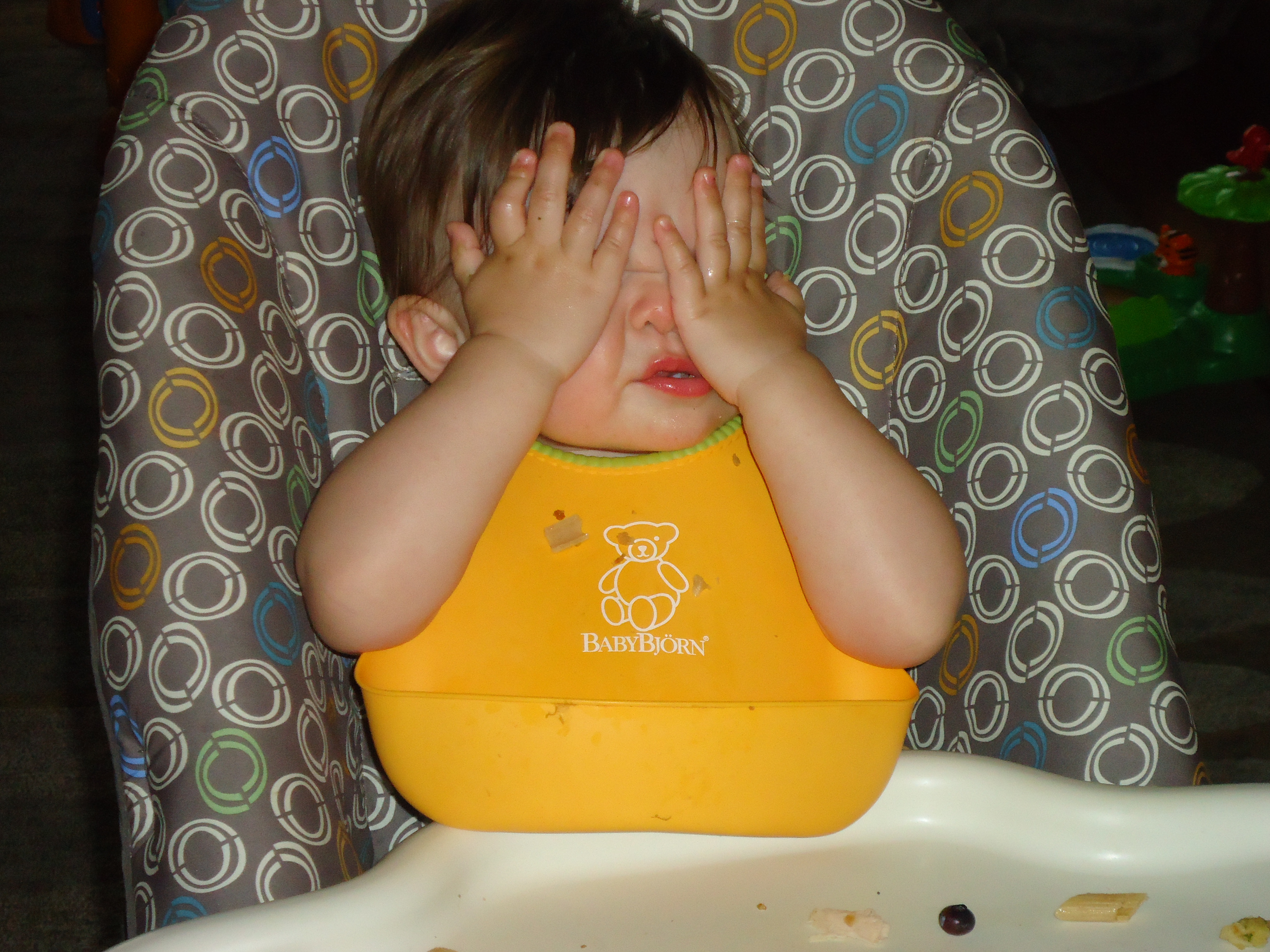 This makes things really interesting especially during mealtime. When Maddie has had enough to eat now, she alerts us to this fact by rubbing her hands into her hair and hiding her eyes behind her hands.
