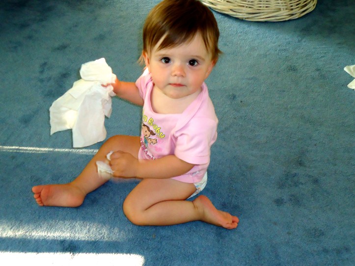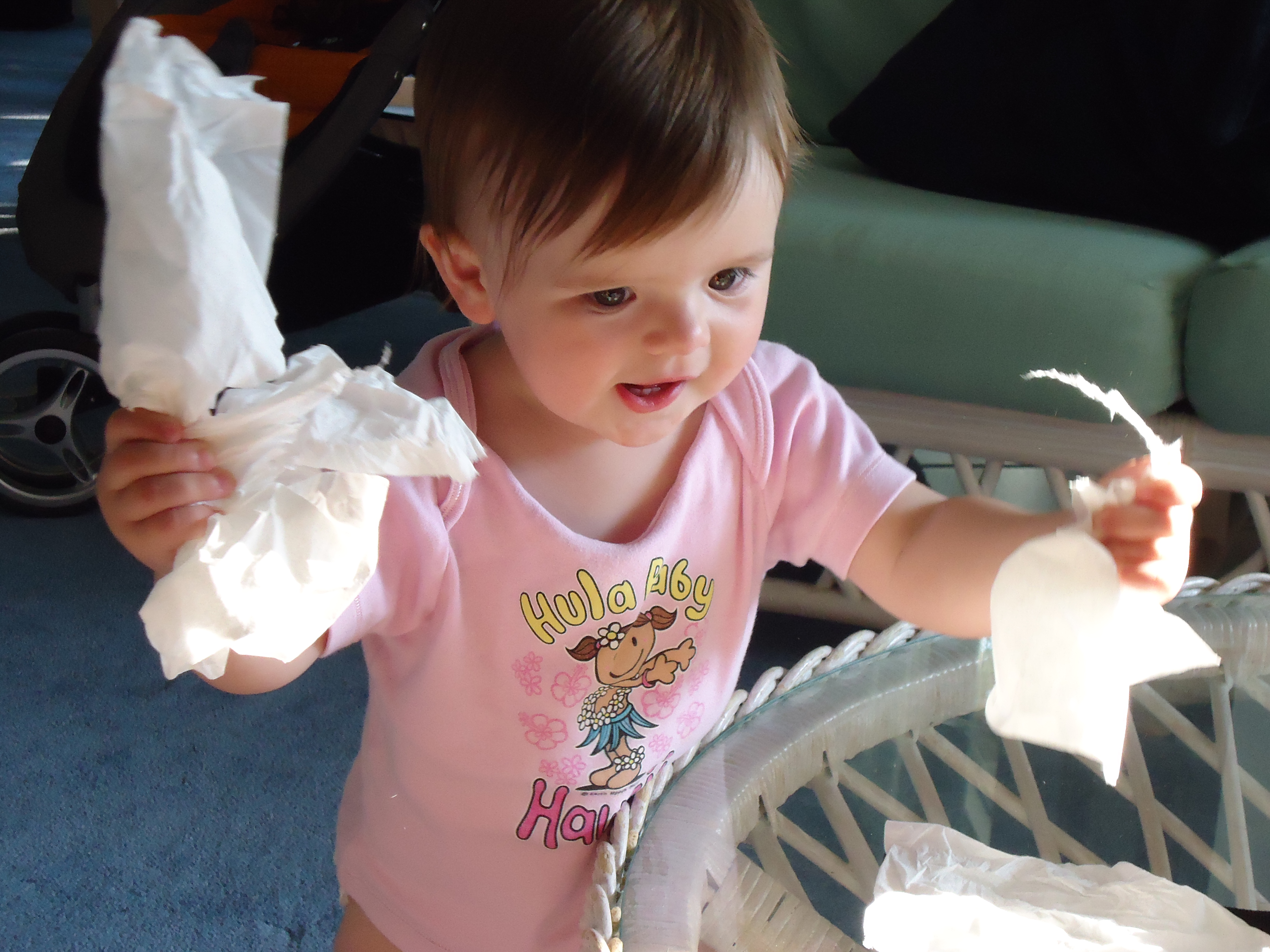 So the challenge now is how to keep an outdoor girl entertained while indoors. As always, trashing and shredding paper ranks high on Maddie’s activity schedule. But bumping her head on multiple surfaces is quickly moving up the list. The baby has also discovered the amazing world of yanking open up cabinets and raiding the contents inside.