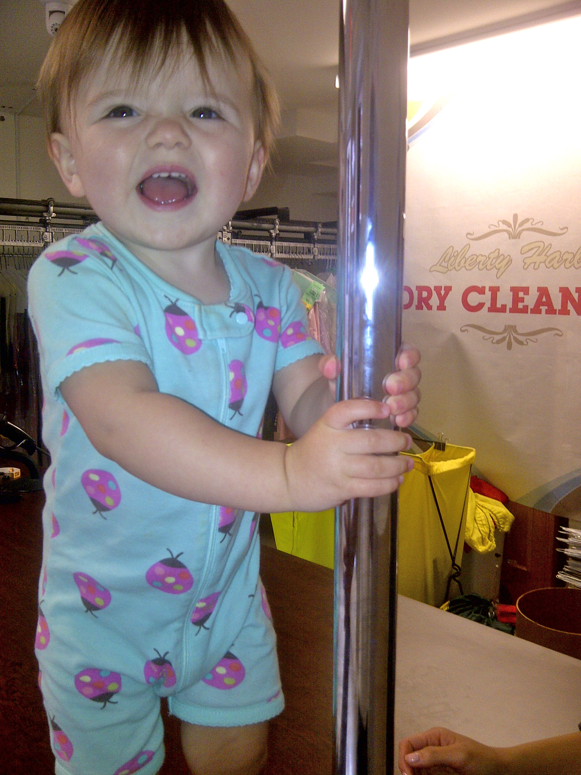 Before we knew it, Maddie transformed the drycleaners into her own Wednesday morning dance party. She grabbed the pole and executed her most prolific Maddie shuffle to date.