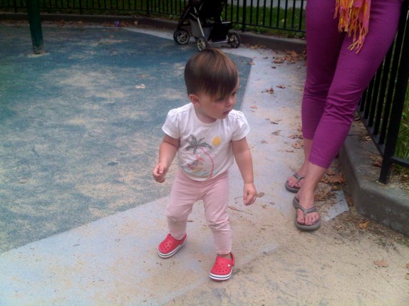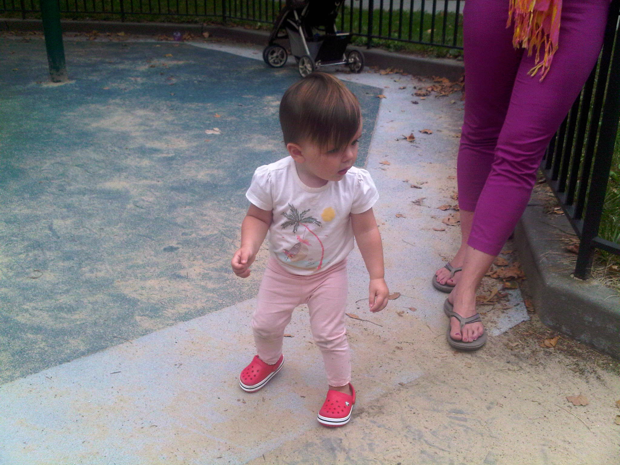 When Maddie keeps her shoes on for more than five minutes, it’s time to hit the park. After all, we can’t let the little girl run around the park going commando! So with her little red Crocs strapped to her feet, we set Maddie free at the swing set!