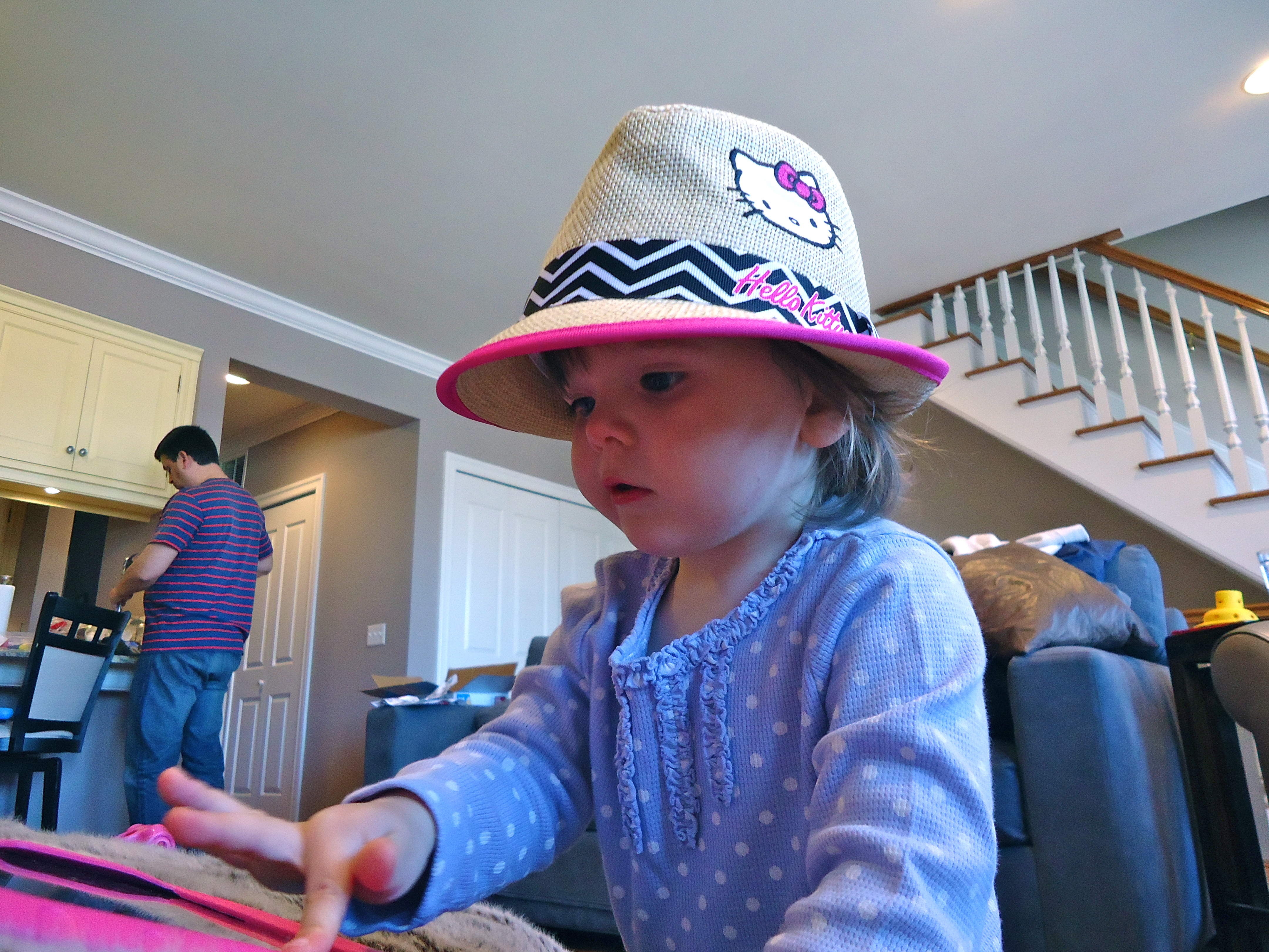 Love the hat. Can’t believe she is actually leaving it on her head given her dislike of wearing anything in her hair.